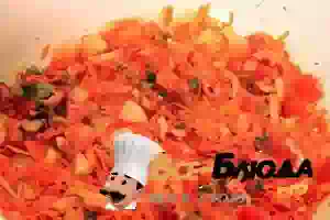 2. Немного поджарить на растительном масле в течении 5 минут, добавить помидоры, нарезанные кубиком, тушить еще 2-3 минуты.
