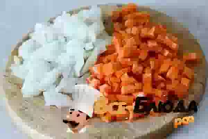 3. Морковь вымыть, очистить и порезать маленькими кубиками. Лук и чеснок мелко порубить.