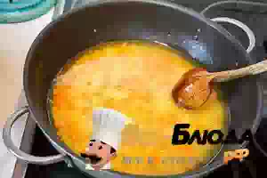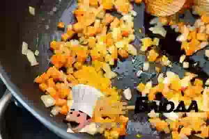 4. В кастрюле с толстым дном разогреть растительное масло и прогреть на нем куркуму. Добавить морковь, лук и чеснок. Обжаривать, помешивая, 4-5 минут.