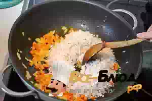 5. Пересыпать к пряной овощной зажарке рис и перемешать.