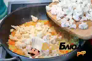 2. Пока с риса стекает вода, подготовить овощи для плова. Цветную капусту разобрать на маленькие соцветия. В кастрюле вскипятить подсоленную воду и бланшировать в ней цветную капусту примерно 5 минут. Слить воду и откинуть капусту на дуршлаг.
