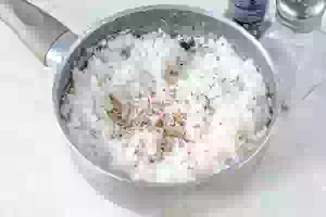 2. Рис тщательно промываем и заливаем 400 мл воды. Отвариваем до готовности, примерно 20 минут после закипания.