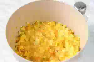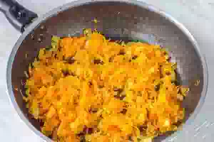 6. В сковороде разогреваем 2 ст. ложки растительного масла и обжариваем лук с морковью примерно 8-10 минут. Затем даём немного остыть.