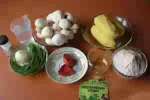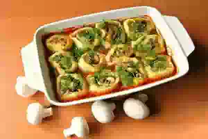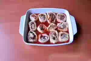 11. Картофельный рулет с грибами нарезаем кусочками и размещаем их вертикально в форме, смазанной маслом. Заливаем картофельные рулетики приготовленной томатной заливкой. Отправляем в духовку, разогретую до 180 градусов, на 25 минут.