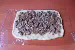 9. Стол выстилаем пищевой пленкой, немного смазанной маслом, и выкладываем картофельное тесто в виде прямоугольника. На пласт картофельного теста выкладываем слой грибов.