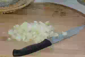2. Репчатый лук почистим и мелко нашинкуем его ножом.