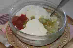 3. Все подготовительные операции осуществлены. Начнём формировать котлетное тесто. В ёмкость с натёртой капустой выложим мелко порубленный лук, разбухшую в воде манку, несколько ложек томатного соуса. Приправу «хмели-сунели», как и томатный соус, добавляем по вкусу. Также по вкусу добавим и соль. Надавим чеснок с помощью чеснокодавилки. Не забудем про майонез.