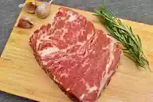 1. Выкладываем стейк на доску. Присаливаем его по вкусу. Добавляем свежемолотый перец. И немного оливкового масла. Равномерно распределяем специи с маслом по всей поверхности стейка.