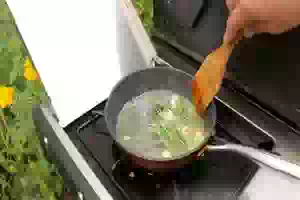 3. В это время нам надо приготовить ароматное масло, для обмазки стейка. Для этого ставим небольшую сковороду или сотейник на огонь. Помещаем в неё 30 г сливочного масла и сразу же добавляем растительное, чтобы сливочное не начало подгорать. Пока масло разогревается, берём 5-6 зубчиков чеснока и придавливаем их плоской стороной ножа, чтобы они лучше отдали свой аромат маслу. Выкладываем зубчики чеснока в разогретое масло. Добавляем в сковороду несколько веточек розмарина и прогреваем всё вместе, помешивая, в течение минуты. Затем выключаем огонь и оставляем ароматное масло на плите.