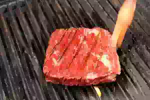 4. Разжигаем гриль и даём ему разогреться до температуры 180 градусов. Выкладываем стейк на гриль на прямой сильный жар и обжариваем его 2 минуты. Через 2 минуты переворачиваем стейк на другую сторону. Наносим на обжаренную сторону стейка ароматное масло с чесноком и розмарином. Ещё через 2 минуты второй раз переворачиваем стейк. Смазываем маслом его вторую сторону. Затем снимаем стейк с гриля и даём ему отдохнуть 10 минут. Я не уверен, что вегетарианскому стейку надо отдыхать, но тем не менее, я попытался полностью сохранить технику приготовления.