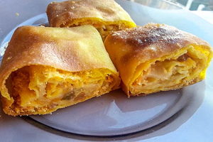 Яблочный штрудель. Рецептов яблочного штруделя много. Этот готовится из готового тесто фило с начинкой из кисло-сладких сочных яблок с медом, сахаром и миндалем. Готовый штрудель подают с ванильным соусом.