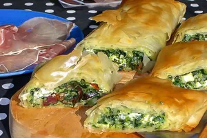 Штрудель летний со шпинатом и солнечными помидорами. Предлагаю вашему вниманию лёгкий, несладкий штрудель, который отлично подойдёт к летнему ужину в беседке. К готовому к штруделю было бы кстати прошутто и любимое вино. Основа штруделя - листы готового тесто фило.