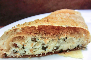 Штрудель с рикоттой и фетой. Для этого штруделя достаточно готовых листов теста фило. Тесто смазывают топлёным сливочным маслом и обсыпают сухарями. Начинку готовят из смеси феты и рикотты с добавлением мелко нарезанной зелени укропа и зеленого лука. Вот такой несладкий штрудель.