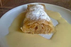 Яблочный штрудель. Рецептов яблочного штруделя много. Этот готовится из готового тесто фило с начинкой из кисло-сладких сочных яблок с медом, сахаром и миндалем. Готовый штрудель подают с ванильным соусом.