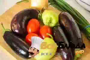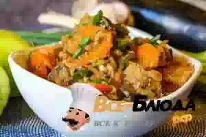 4. Добавить к луку еще немного масла и положить подготовленные баклажаны. Обжаривать их, помешивая, чтобы не подгорали. Когда баклажаны хорошо обжарятся, можно добавить к ним остальные овощи.