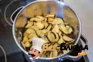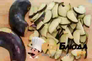 2. У баклажанов срезать кончики, потом каждый из них разрезать вдоль пополам, а затем половинки - на полукружья толщиной около 1 см. Форма нарезки не принципиальна, можно резать хоть кубиками, хоть кружками. Кто как привык. Ломтики баклажанов сложить в миску, пересыпая солью, положить на них небольшой гнет и оставить на 30 минут. Когда баклажаны дадут сок, слить его, баклажаны промыть и отжать руками. После такой обработки баклажаны впитают при жарке меньше масла.