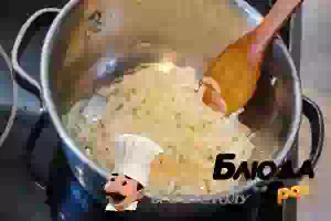 3. Лук порезать полукольцами, сладкий перец - полосками, очищенную морковь кружочками, а помидоры - дольками. В толстостенную кастрюлю налить растительное масло, хорошо его прогреть и добавить лук. Пассеровать его до мягкости, помешивая лопаткой.