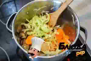 5. Отправить в кастрюлю сладкий перец и морковь. Готовить, помешивая, примерно 5 минут. За это время морковь станет почти мягкой.