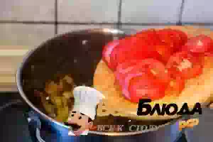 6. Теперь можно добавить ломтики помидоров, чтобы они дали сок. Размешать овощи, уменьшить огонь до слабого и готовить под крышкой. Помидоры дадут сок, и рагу будет тушиться. Но не забывайте помешивать!