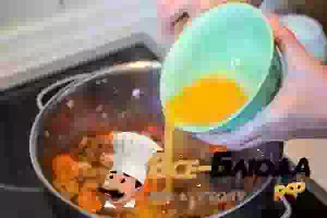 9. Увеличить температуру плиты, залить яйцами овощное рагу и быстро перемешивать, чтобы яйцо равномерно распределилось среди овощей. Когда яйцо свернется, можно снимать кастрюлю с плиты. Подавать готовое овощное рагу с баклажанами и яйцом горячим, как основное блюдо, или холодным на ломтике хлеба как закуску.
