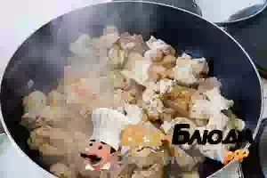 2. В сковороде прогреваем растительное масло и обжариваем курицу около 20 минут, периодически помешивая.