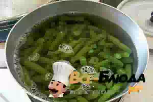 3. В кастрюлю наливаем воду для фасоли. Ставим на огонь. Как только вода закипит, бросаем в кипящую воду фасоль. Добавляем соль, доводим до кипения. Когда фасоль закипит, варим на среднем огне 3 минуты (или в соответствии с рекомендациями на упаковке). Готовую фасоль промываем в дуршлаге под струёй холодной воды.