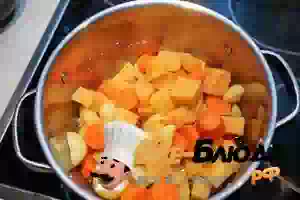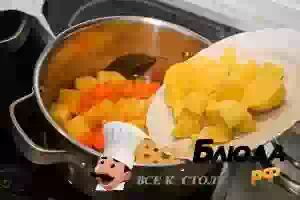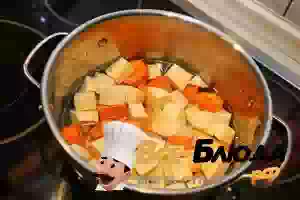 4. Когда репа приготовится, добавить нарезанный картофель, посолить и варить до готовности картофеля. Воду добавлять не надо. Хотя, если она совсем выкипела, то можно чуть-чуть долить.