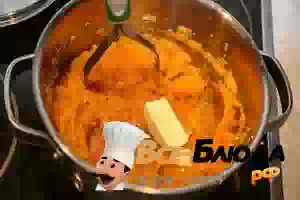 6. Вареные овощи размять толкушкой, добавить сливочное масло и продолжать работать толкушкой до получения максимально однородного пюре. Подливать понемногу сливки или молоко, чтобы получить желаемую консистенцию овощного пюре. Овощное пюре с репой подавать к столу горячим как гарнир или как основное овощное блюдо.