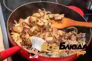 6. В сковороде разогреть растительное масло, добавить нарезанный бекон и обжаривать, помешивая, пока он не станет золотистым. Добавить нарезанные грибы и лук. Жарить, помешивая, 3-5 минут. Посолить по вкусу.
