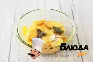 5. К нарезанный картофелю добавьте смесь трав, черный молотый перец, посолите. Все хорошо перемешайте. Специи и приправы добавляйте по вкусу и желанию.
