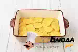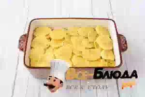 6. Форму для запекания смажьте растительным маслом. На дно выложите половину кружочков картофеля.
