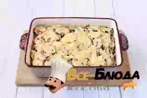 12. Сверху залейте оставшейся сметанной заливкой. Запекайте картошку с грибами в заранее разогретой до 190С духовке около 40 минут. Готовность проверяйте, проткнув кружочек картофеля ножом. Если картофель мягкий, значит, блюдо готово. Время и режим приготовления могут отличаться, так как зависят от особенностей работы духовки.