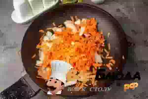 4. Лук мелко нарежьте, морковь натрите на терке. Выложите овощи в сковороду с раскаленным маслом и жарьте пару минут.