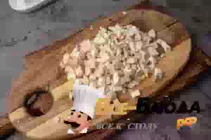 5. Пока жарятся овощи, ножки грибов мелко нарежьте.