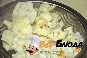 3. Капусту отвариваем до состояния «аль денте», то есть, чтоб она оставалась слегка сыроватой и хрусткой. Отбрасываем отварную цветную капусту на дуршлаг и обсушиваем бумажным полотенцем.