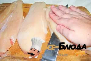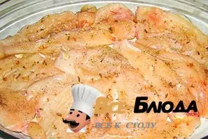 4. Куриные грудки промываем и режем на кусочки. Мясо солим, посыпаем небольшим количеством молотого перца и приправой.