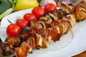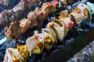 5. Уложить шашлык из грибов с беконом и луком над тлеющими углями. Готовить, аккуратно поворачивая шампуры, примерно 15 минут. За это время грибы успеют пропечься и пропитаться жиром. Готовый шашлык из лисичек с беконом и луком переложить на блюдо и сразу подавать к столу, пока грибы горячие.
