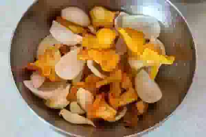 3. Репчатый лук очистить, разрезать на четвертинки и разобрать на дольки по 1-2 листика в каждом. Добавить лук в миску с грибами, перемешать. Миску накрыть пищевой пленкой и убрать в холодильник на 1-2 часа. За это время свежие лисички успеют промариноваться.