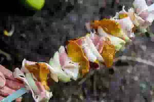 5. Уложить шашлык из грибов с беконом и луком над тлеющими углями. Готовить, аккуратно поворачивая шампуры, примерно 15 минут. За это время грибы успеют пропечься и пропитаться жиром. Готовый шашлык из лисичек с беконом и луком переложить на блюдо и сразу подавать к столу, пока грибы горячие.