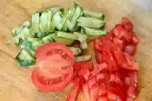 1. Помидоры, огурцы, свежую зелень вымыть под проточной холодной водой и обсушить на бумажных полотенцах. Если у огурцов толстая кожица, то срезать её овощечисткой. Огурцы нарезать маленькими брусочками. Примерно так же нарезать помидоры. Зелень мелко порубить.