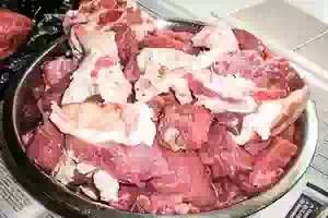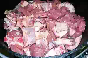 1. Первым делом казан, учитывая его новизну и неприспособленность к приготовлению продуктов, была произведена первая, но щадящая, дрессировка казана. Для чего в него всыпали пачку крупнозернистой соли. И поставили казан калиться … Забегая вперёд – прокалить и потом промыть. Просто горячей водой. Упаси Вас … только вода. Чистая и горячая. Ну а пока прокаливается – готовим продукты. Мясо. Три сорта. Барашкины рёбрышки. Их просто на кусочки нарежем. Такие – чтобы в рот влезали.