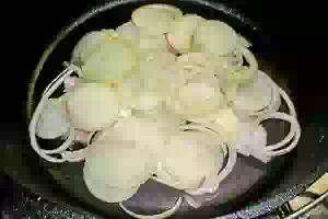 5. Главное в этом блюде … вовсе не барашкины подарки. Главное – тут ОВОЩИ … Смотрите сами, как их готовим к, так сказать … использованию. Остальное … по ходу. Ну а дальше начинаем «заряжать» посуду нашу новую … Сначала выкладываем на дно (в этом казане, как специально для дымлямы, оно плоское и толстое) ломтики курдючного жира. Потом слой лука и солим. Соль должна быть крупная … грубая такая и негламурная … серая.