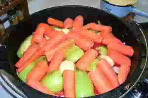 9. И поверх выкладываем слой сочного сладкого перца. Особенно не старайтесь. Лучше просто зелёного. Хотя можно и разноцветного. Только все эти помидоры и перец …, что называется разойдутся … Между перчинками кладём кусочки репы. Потом морковка. Режем её крупно. Не мельчим.