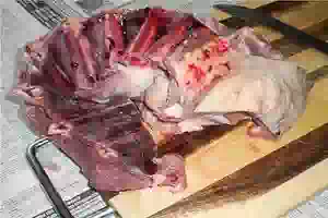1. Первым делом казан, учитывая его новизну и неприспособленность к приготовлению продуктов, была произведена первая, но щадящая, дрессировка казана. Для чего в него всыпали пачку крупнозернистой соли. И поставили казан калиться … Забегая вперёд – прокалить и потом промыть. Просто горячей водой. Упаси Вас … только вода. Чистая и горячая. Ну а пока прокаливается – готовим продукты. Мясо. Три сорта. Барашкины рёбрышки. Их просто на кусочки нарежем. Такие – чтобы в рот влезали.