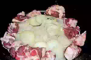 7. В серединочку барашкины рёбрышки и между ними кусочки телячьего филе … поплотнее …, и уминаем, уминаем, уминаем. Очень плотно слой должен лечь. Потом зира и прочие специи. Шафран мал-мало, перец …. И т.д. Сверху лучком и снова уминаем!!!