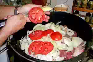 8. Потом берём пару БОЛЬШИХ и ОЧЕНЬ СПЕЛЫХ помидор. И режем их над казаном, ВПОПЕРЁК!!! В результате … имеем вот такую картинку.