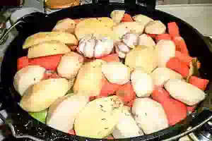 10. И вот подходит очередь картофеля. Можно и нужно поверх всего зиры и остальных, по вкусу, специй. Чесночок кладём целиком. Только шелуху сверху почистим и корешки с землёй отскребём. Кстати, как Совет. Если есть достаточное количество уже полностью созревшей репы, то она вполне может заменить картошку. Зелени бросим сверху … прямо в пучках. Разной. ВСЁ!!! Сырой Дымляма загружена. И закрываем крышкой. Крышка на этом казане очень большая. В смысле тяжёлая. Это очень хорошо! И ставим казан на сильный огонь. Ненадолго! Минут на десять – пятнадцать. Ждём, пока зашкворчит. Потом опять уменьшаем огонь до самого минимума. И душим … т.е. тушим … вообщем готовим Дымляму … часа полтора. А лучше Два. Ну вот!!! Снимаем крышку!