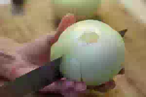 1. Крупные луковицы очистить, немного срезать верхушку и аккуратно подрезать донце. Старайтесь подрезать минимально, чтобы луковица не развалилась на отдельные листочки.