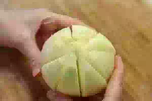 3. Теперь надо очень аккуратно по одному отгибать лепестки от центра. Это делается для того, чтобы потом нафаршировать луковицу мясным фаршем как можно плотнее.