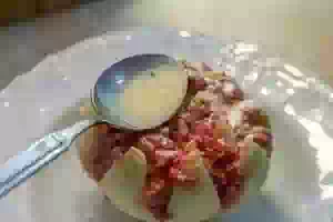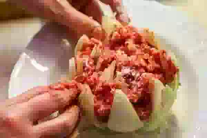 8. Наполнить промежутки между лепестками лука мясным фаршем.